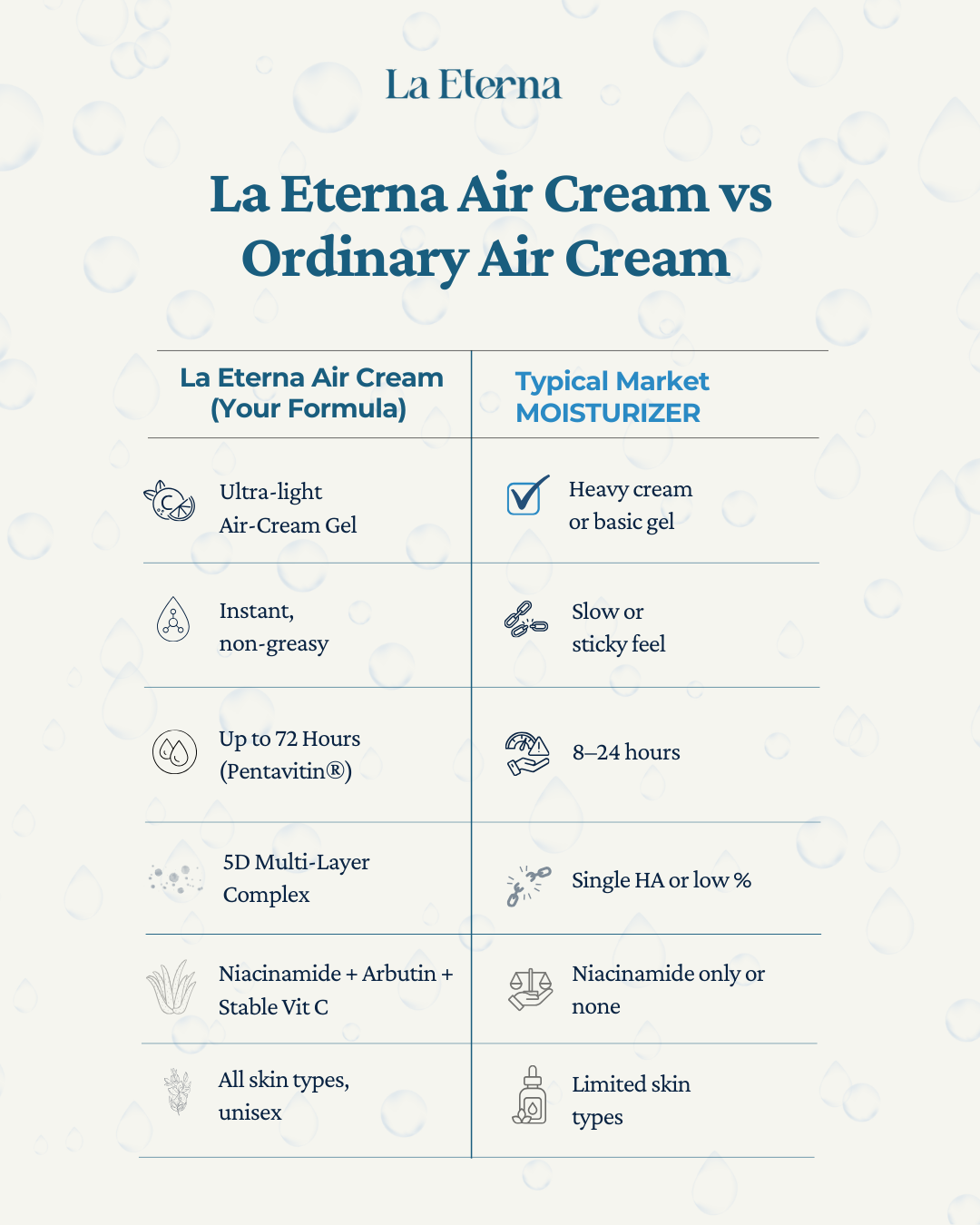 Ultra-Light Air-Cream Texture – Instantly melts into skin without heaviness, delivering deep hydration with a fresh, weightless finish